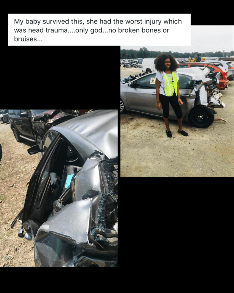 When my mother and I arrived at the junkyard, they had to pull my car from the back of the yard to the front. As they moved the vehicle, some guys remarked, “There’s no way anyone survived that.”